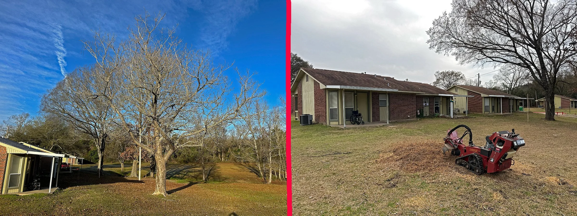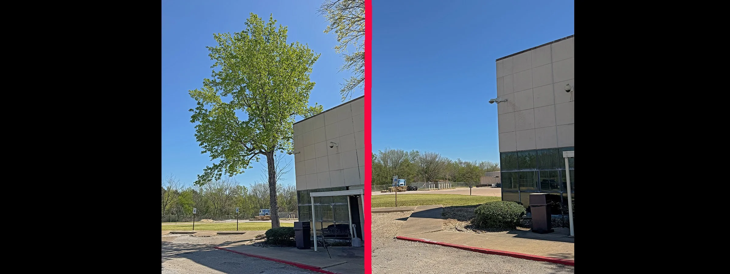 Before and After of a tree removal at a apartment complex with stump grinding.