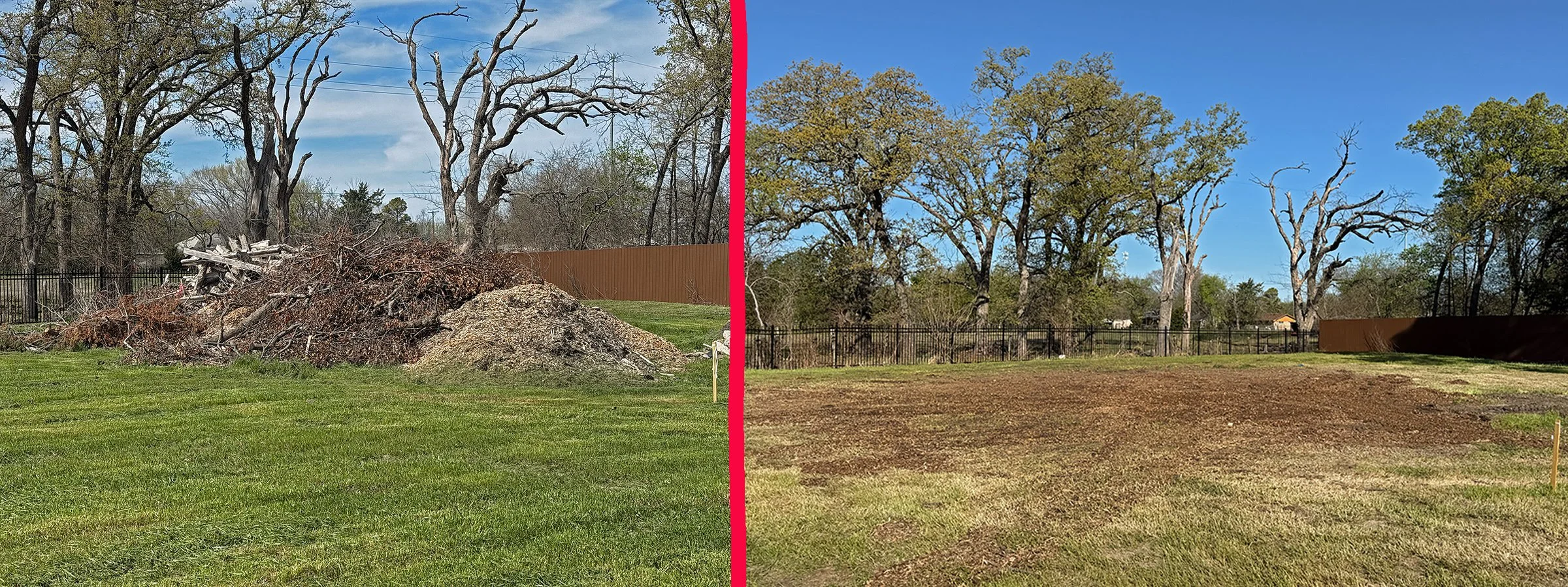 Before and After Removing a few dead hackberry tree’s very close to a fence.